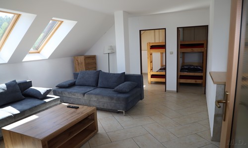 - běžné vybavení apartmánu: 6 lůžek, stůl, židle, elektrika, wc, sprcha